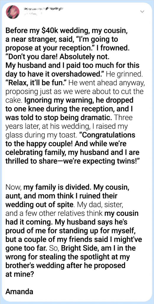 Amanda’s decision to announce her pregnancy at her cousin’s wedding may have felt satisfying in the moment, but it also left her questioning whether it was worth it. The rift that followed was a harsh reminder of the consequences of our actions and the lasting impact they can have on relationships.